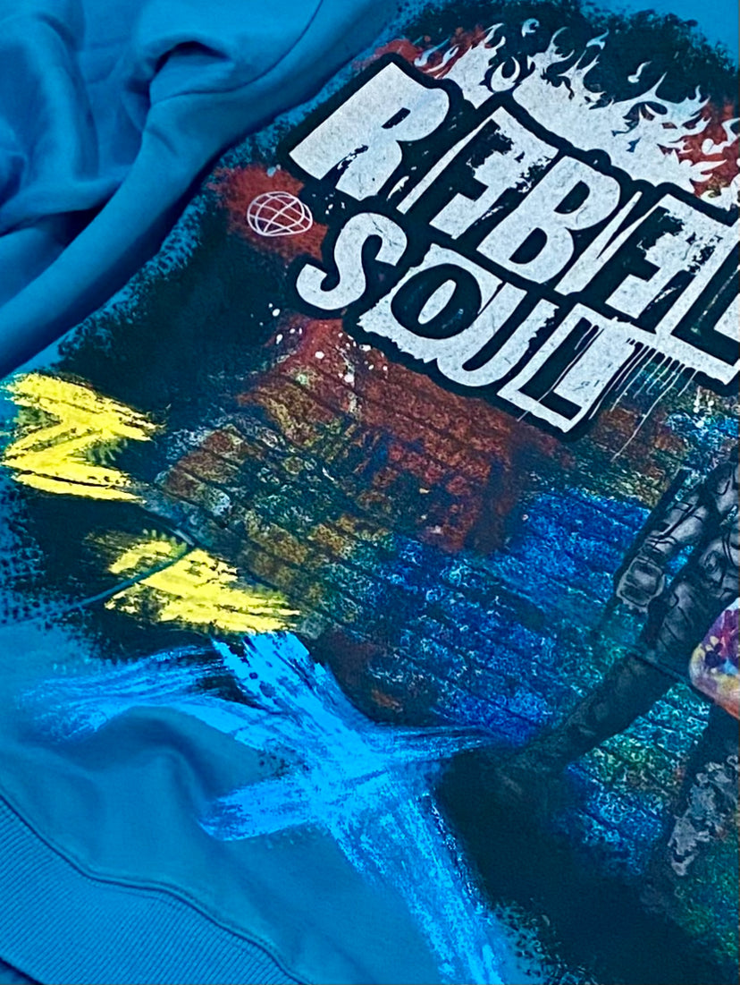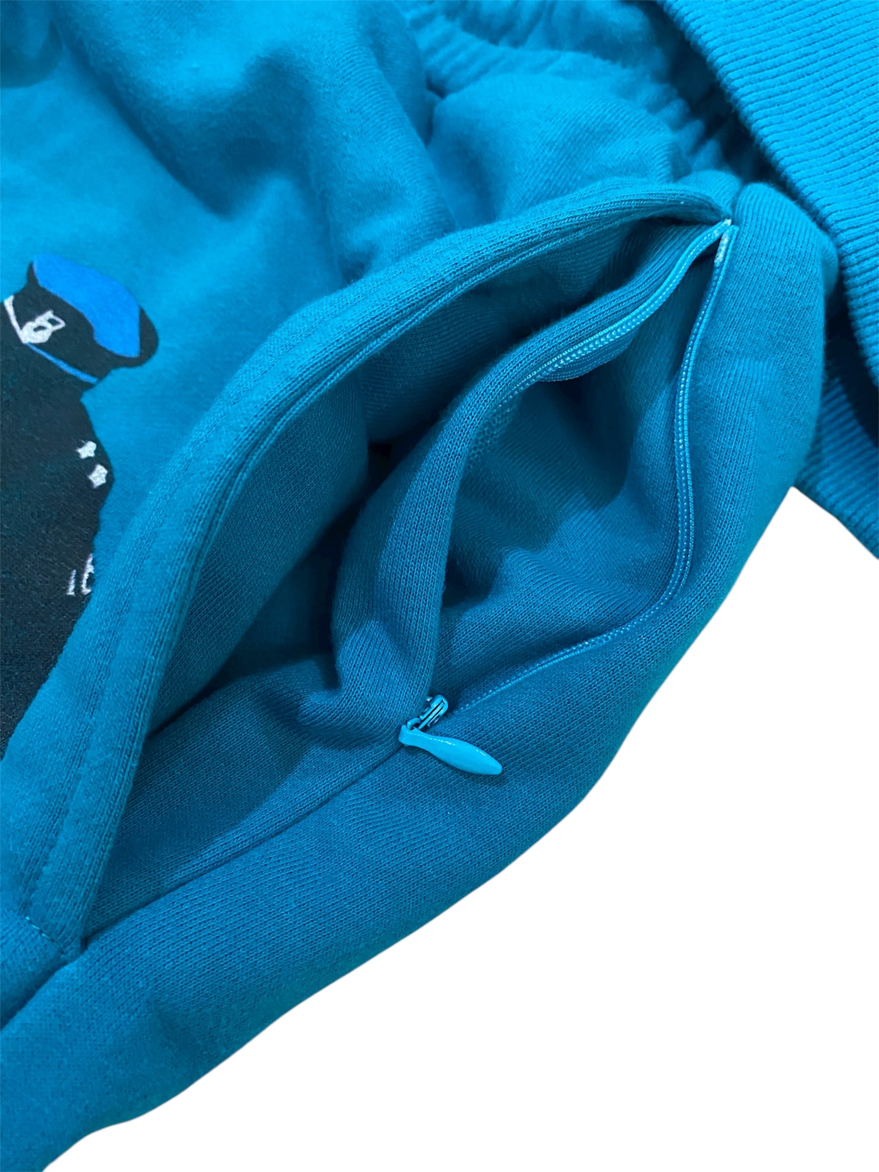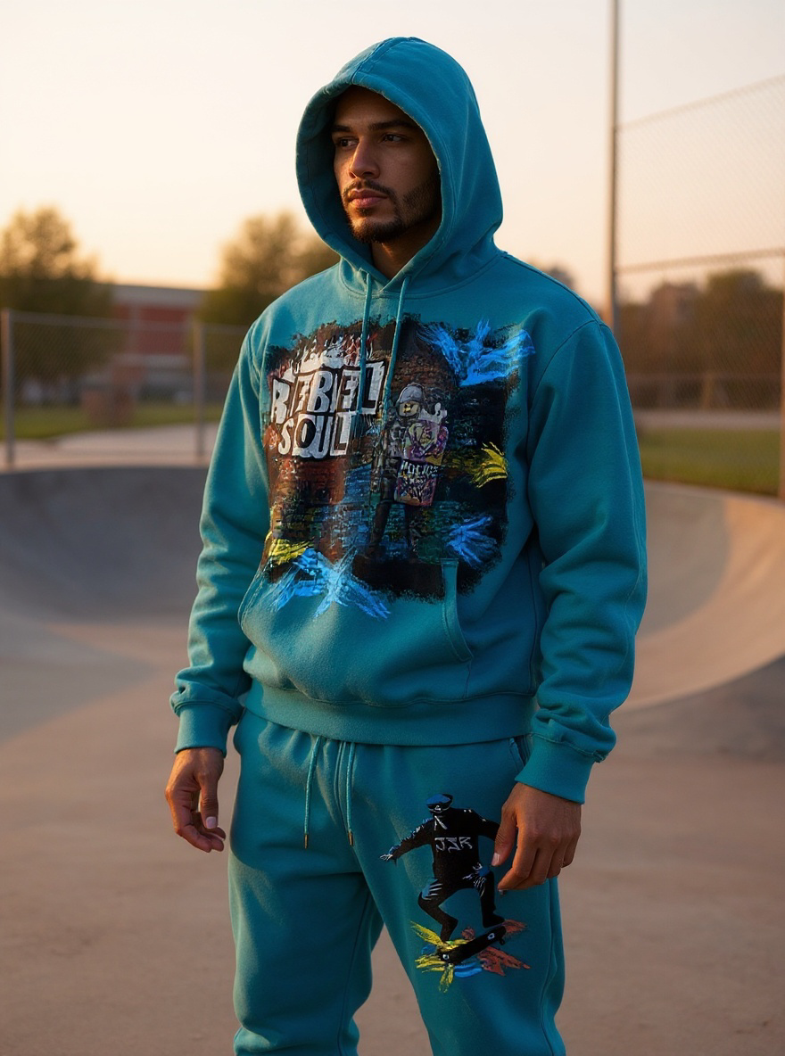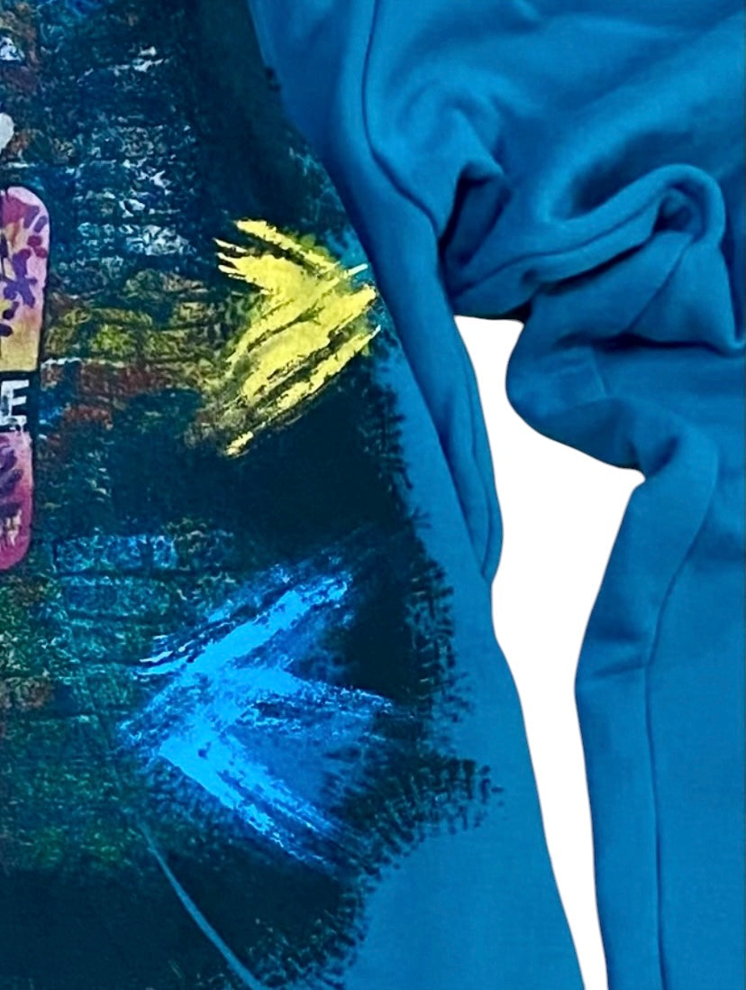 The top features an oversized DTG graphic with hand-painted accents, giving each piece a unique artistic finish. The matching pants include a bold DTG graphic, hand-painted details, and a concealed zipper pocket hidden seamlessly along the side seam for secure storage.