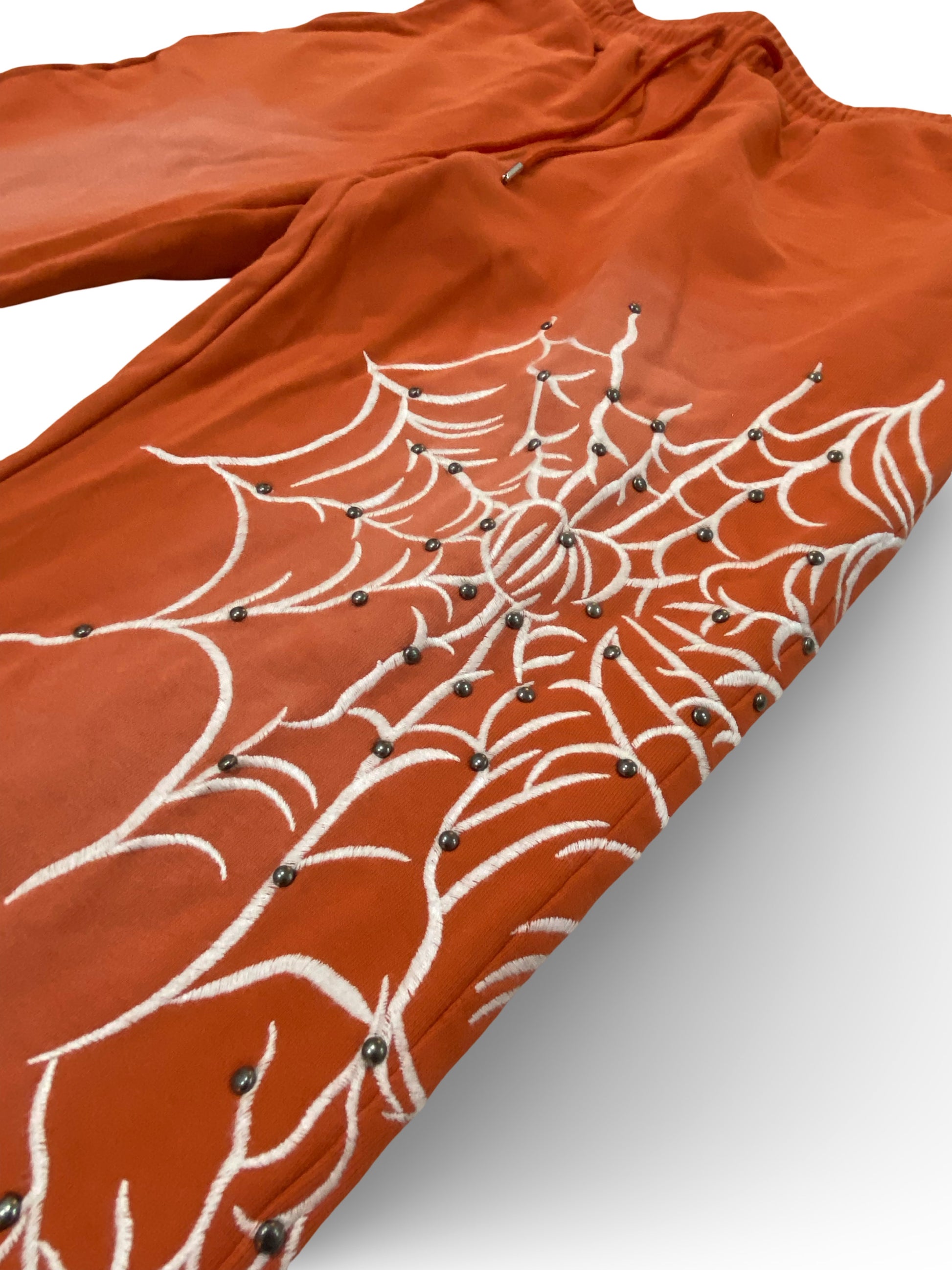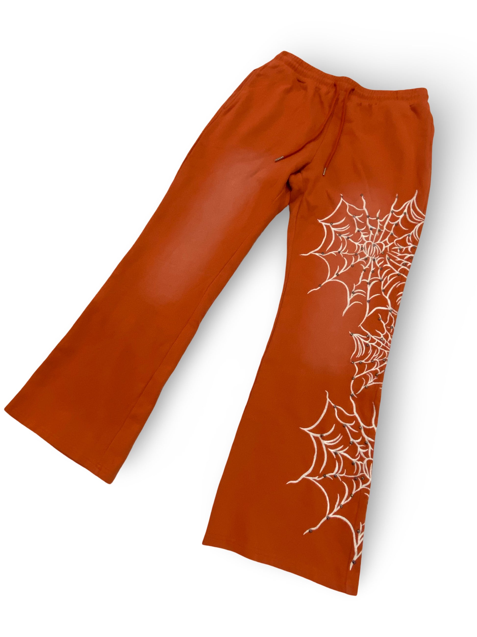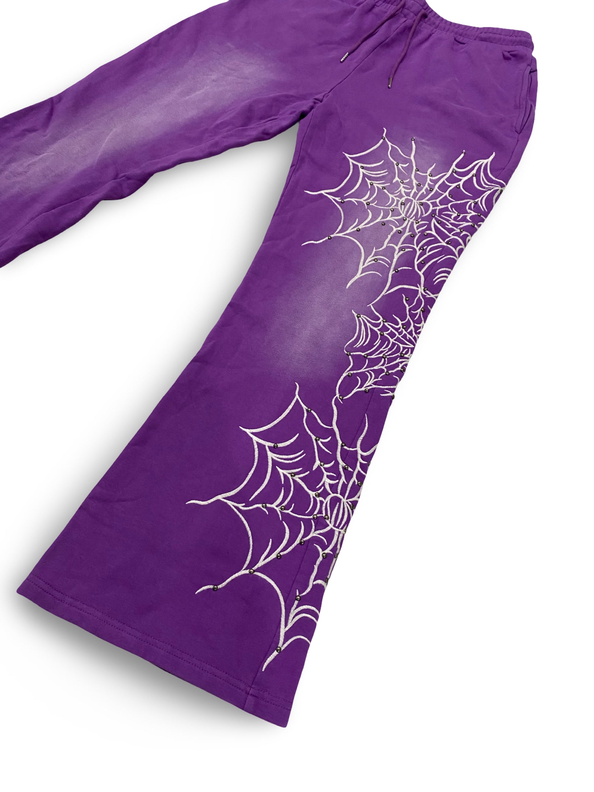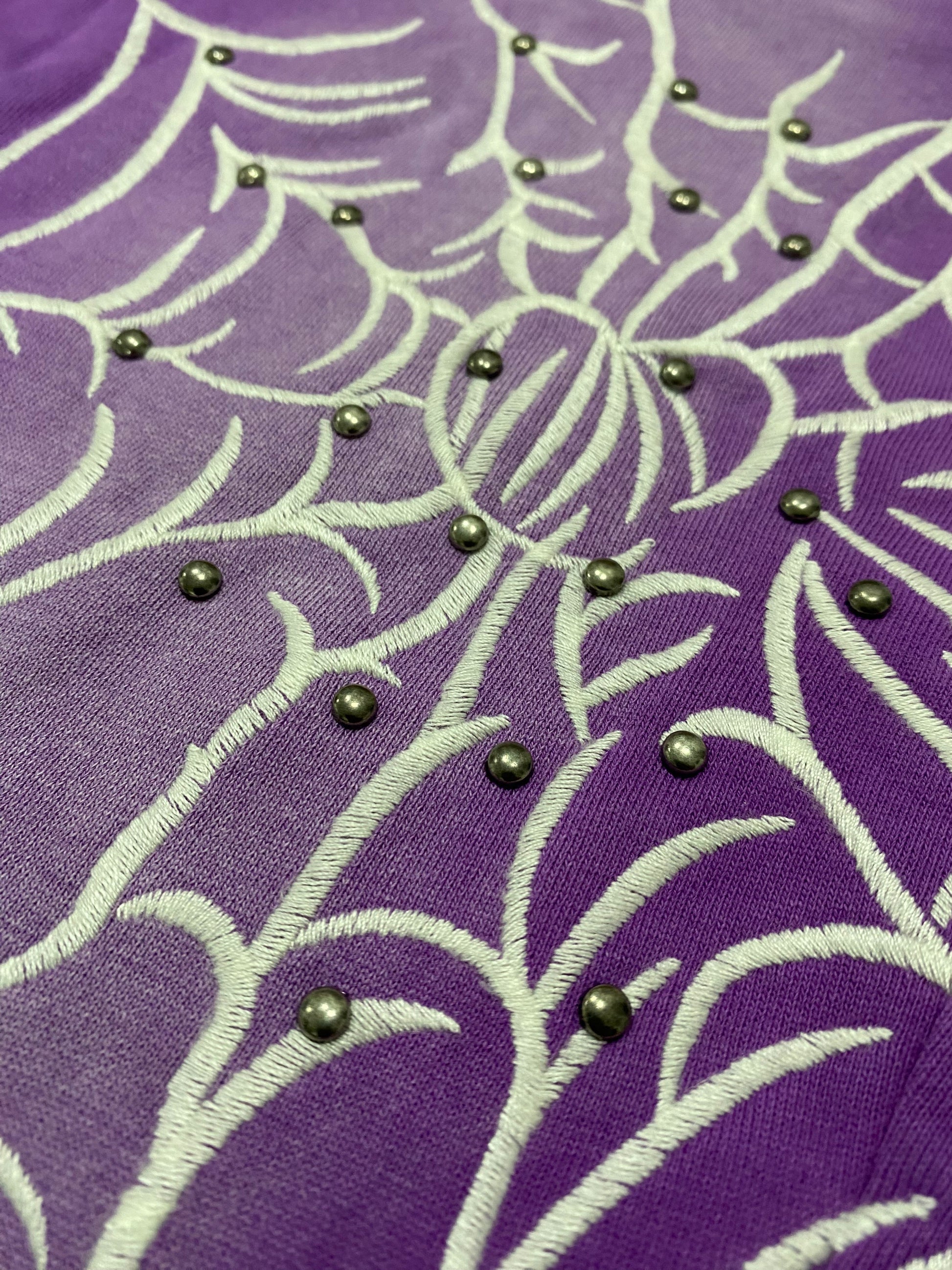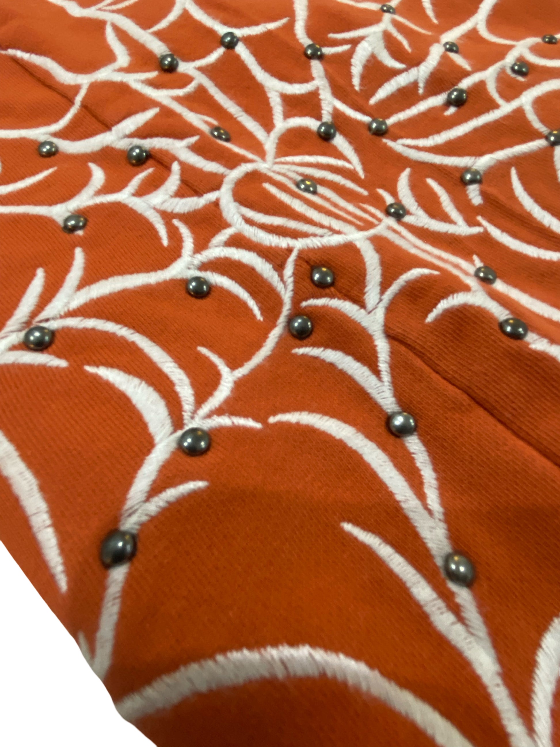 A bold fully embroidered spider-web design travels from the thigh around the back of the leg to the ankle, adding custom artistry. Includes a concealed zipper pocket hidden in the seam for secure storage.